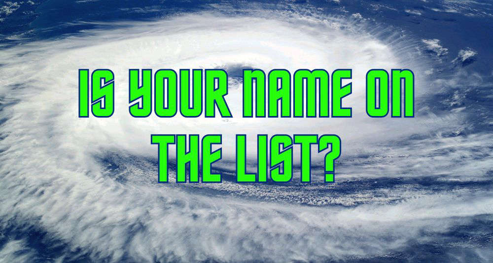 I joke but the process of ascribing a moniker to a Tropical Storm/Hurricane system is one that is taken very seriously. According to nhc.org, since 1953, Atlantic tropical storms had been named from lists originated by the National Hurricane Center. They are now reportedly maintained and updated through a strict procedure by an international committee of the World Meteorological Organization.