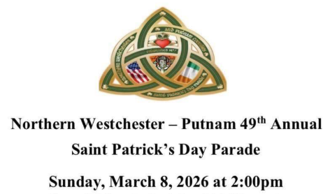 - ON SUNDAY, MARCH 8TH, WE’RE IN THE 49TH ANNUAL NORTHERN WESTCHESTER-PUTNAM ST. PATRICK’S DAY PARADE—IT STEPS OFF AT 2PM ON ROUTE 6 IN MAHOPAC!